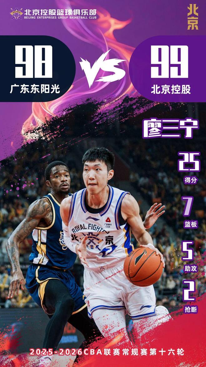 1月17日,北控男篮南下广东首个客场对阵广东东阳光。本场比赛,双方经历了全程势均力敌的缠斗,凭借廖三宁最后阶段精准中投以及压哨神仙球,北控男篮以99:98绝杀广东东阳光。