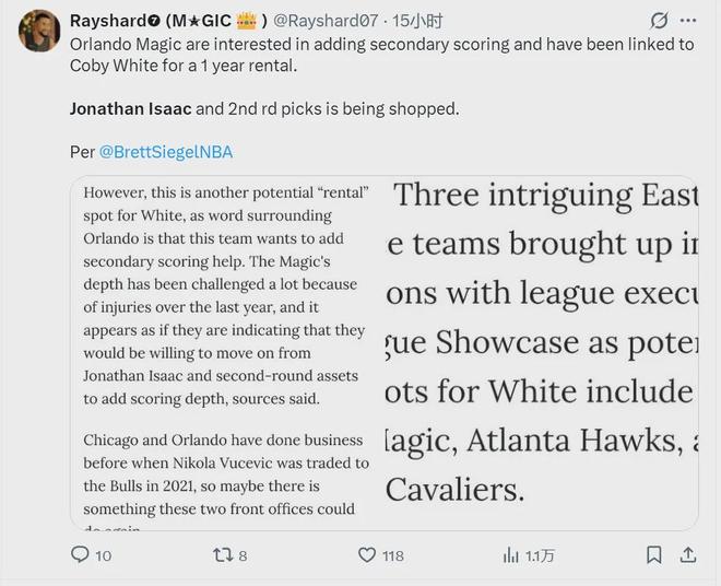艾萨克+多个次轮签,魔术多换1的报价,你觉得能换来科比-怀特吗?