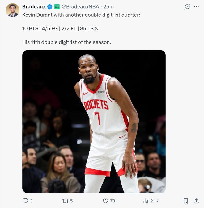这是本赛季第二次遇上开拓者,乌度卡深知开拓者的特点是防守反击,但因为缺少了一号位与申京球队的运转球本就是弱点,杜兰特首节5中4,罚球2中2拿到10分1篮板已经非常高效,但伴随2次失误。