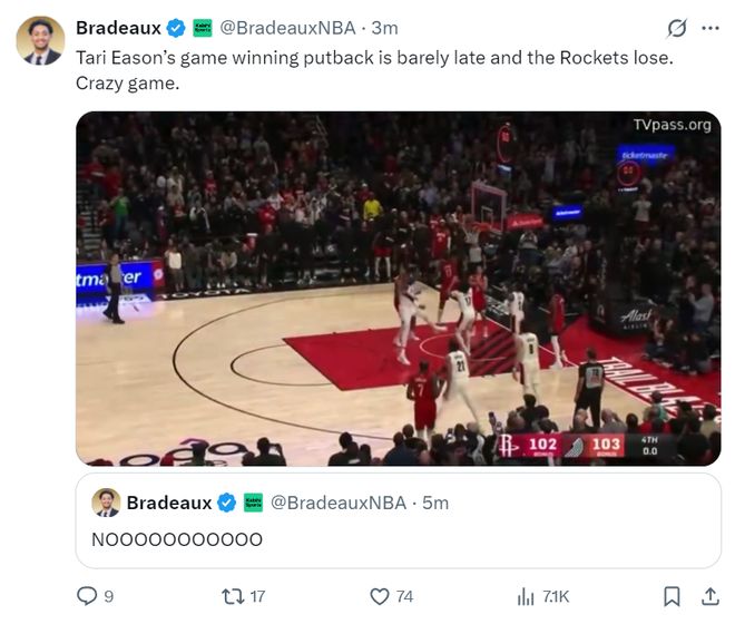 火箭记者晒出伊森补篮绝杀超时,写道:NO!!!伊森的补篮绝杀超时了,他为了球队的胜利付出一切,这场比赛太疯狂了。