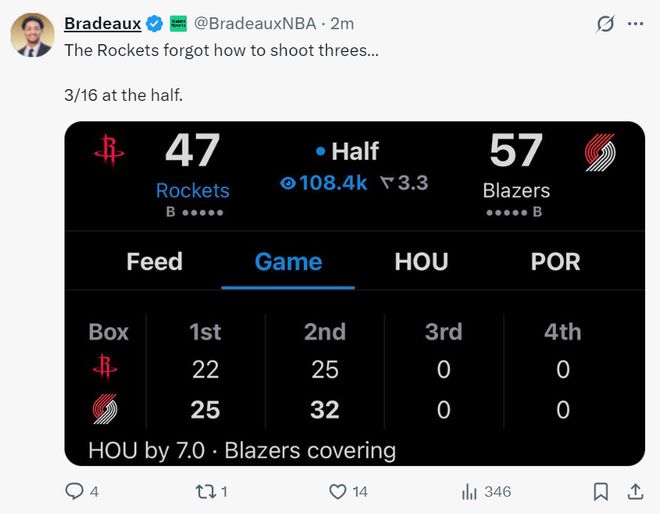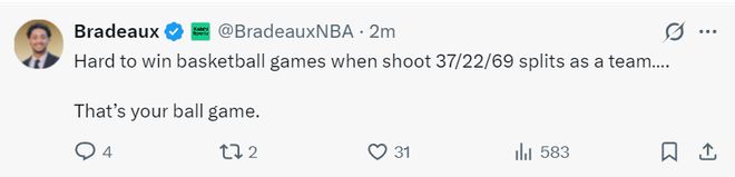 火箭记者Bradeaux:如果一支球队,命中率37%,三分命中率22%,罚球命中率69%还能赢球,那等于是你自己玩球。