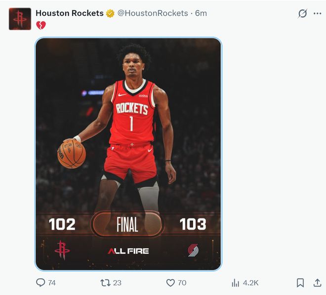北京时间1月8日,火箭以102-103惜败开拓者。此役火箭一度落后开拓者11分之多,可在末节火箭将比赛打入了决胜时刻,杜兰特险些再度化身死神帮助火箭逆转,绝杀中投未能命中,伊森补篮绝杀却被判定超时。赛后火箭官方直呼心碎。