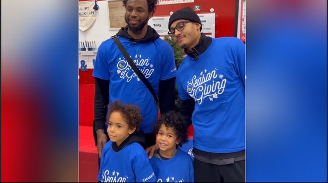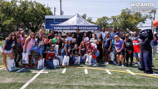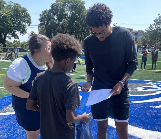 球场之外,普尔为社区发放食物,向斯坦顿小学的老师捐赠物资。