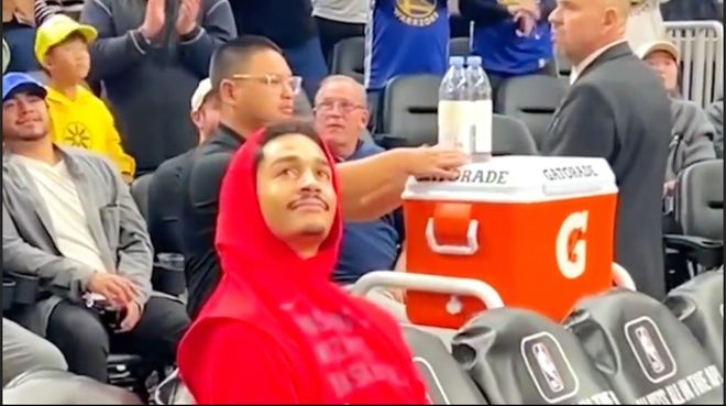 主场播放着普洱在勇士效力期间的比赛集锦。