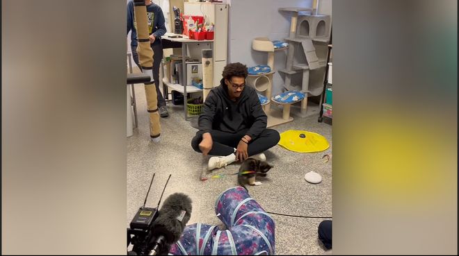 从志愿者手中接过一个色彩鲜艳的逗猫棒,与流浪猫玩耍。
