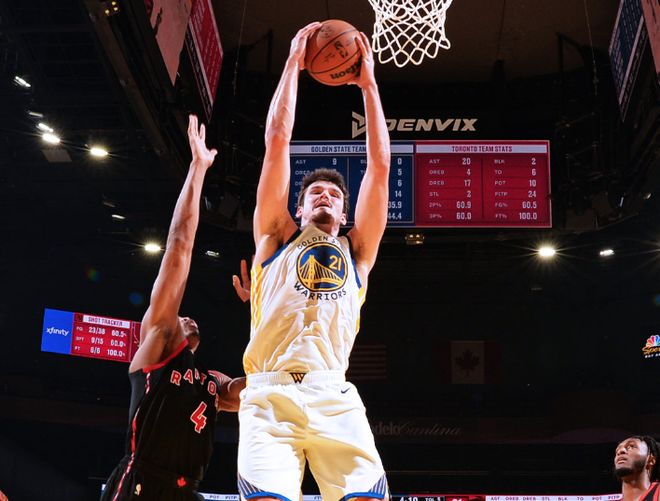 库明加继续军训英格拉姆,单打莫格博,博斯特也续上三分球。节末希尔德造三分犯规,库明加助攻博斯特,三节打完,勇士94-108猛龙,全靠库明加支撑!决战第四节,猛龙替补重新扩大分差,梅尔顿上篮+斯潘塞扔三分,希尔德反击继续追分。猛龙一直都是全主力,希尔德轰三分,库明加造杀伤,节末希尔德和库明加继续扔三分球。最后2分钟,科尔也换下库明加和希尔德,最终勇士127-145惨败猛龙。