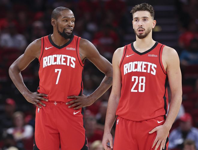 休斯顿火箭队27胜16负高居西部第4位,他们是西部前5队伍中唯一一位没有球星入选全明星首发的队伍——西部第1雷霆的SGA、西部第2马刺的文班、西部第3掘金的约基奇和西部第5湖人的东契奇均锁定一个首发名额,这多多少少有些尴尬!作为休斯顿火箭队的急先锋,死神杜兰特第一个挺身而出向全明星发起冲击。火箭过去2场背靠背打76人和活塞,杜兰特总共出战84分钟,狂轰68分+14篮板+6助攻+1抢断+2盖帽+10记三分球的豪华数据,他绝对配得上一个全明星替补席位。