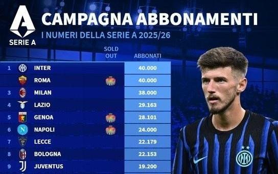 意甲季票销售数量榜:国米、罗马4万张并列第一米兰3.8万第三