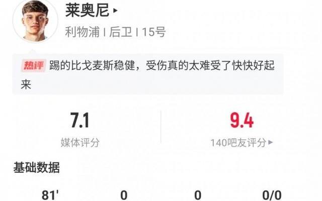 莱奥尼利物浦首秀数据:出战81分钟伤退,6次解围3次拦截3次争顶