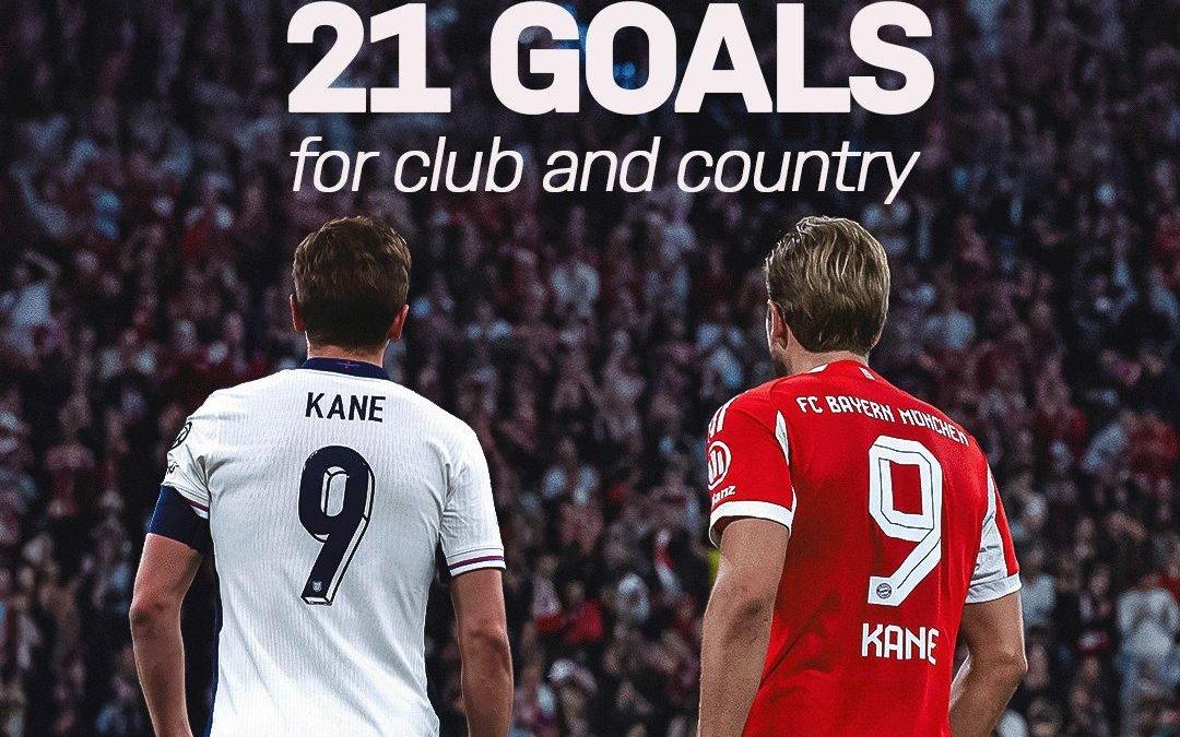 凯恩本赛季至今各赛事21球3助,对阵多特若进球获创造历史