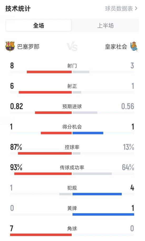 巴萨半场11皇家社会数据:射门83,射正61,控球率87%13%