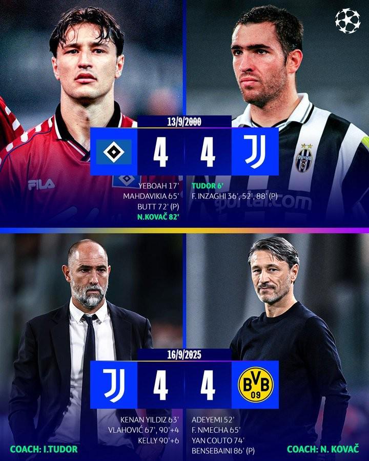 尤文上一次欧冠踢成44是25年前,当时图多尔和科瓦奇同场进球