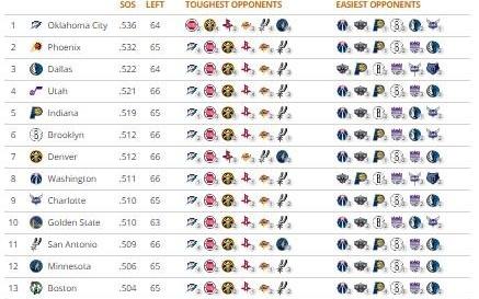 NBA各队剩余赛程难度:雷霆第一,勇士第10,湖人第26,火箭第29