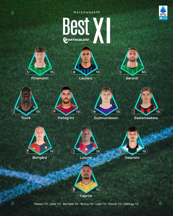 意甲第11轮最佳阵容:劳塔罗领衔,佩7、萨56、贝拉尔迪入选