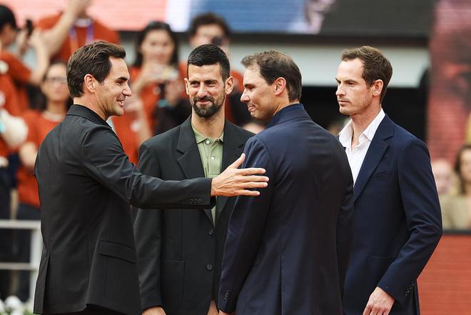 2025年5月25日,法网官方为纳达尔举行致敬仪式,费德勒、德约科维奇、穆雷到场祝贺。纳达尔在法网赛事中告别。视觉中国 图