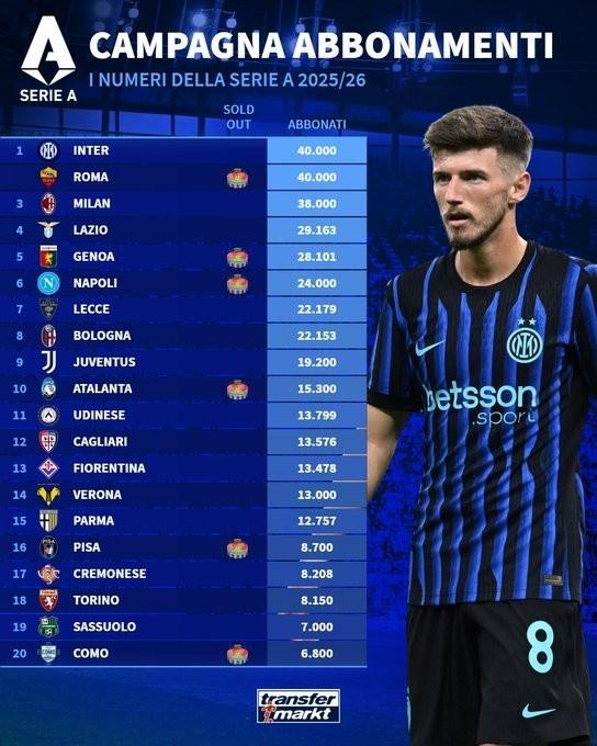直播吧9月25日宣 2025-26赛季意甲各队季票销售数量榜出炉,其中国米、罗马4万张并列第一。