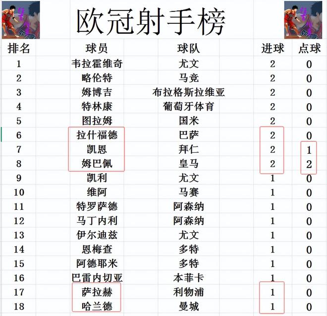 射手榜方面,法兰克福今天取得5个进球,有2个是乌龙,没有人梅开二度。拉什福德和特林康今天梅开二度,追上凯恩,姆巴佩,图拉姆,韦拉霍维奇等人2球并列榜首。哈兰德破门,和萨拉赫,马丁内利等人都是1球上榜。