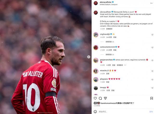 麦卡利斯特赛后在个人社媒晒出本场照片,配文写道:“默西塞德德比胜利属于我们,球队拿出了很棒的表现,这是必须要取胜,必须全力拼搏的比赛,又一场主场胜利!”