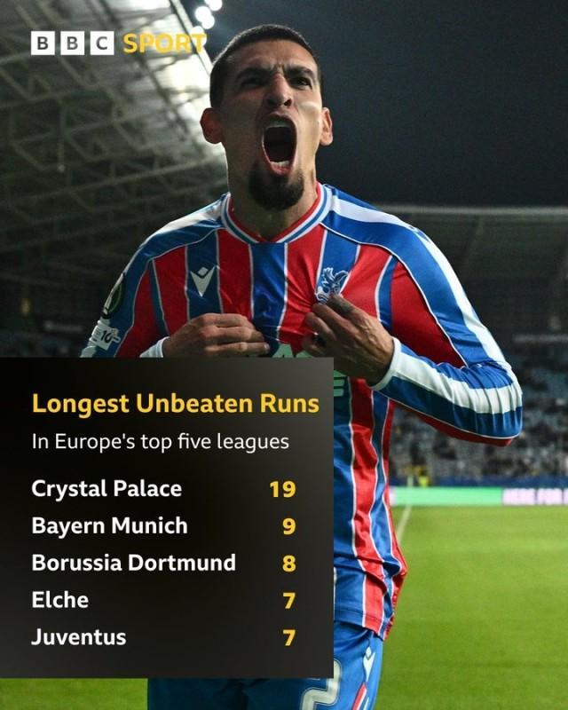欧协杯第2轮,比赛后段10打11的水晶宫2比0战胜基辅迪那摩,第31分钟穆尼奥斯首开纪录,第58分钟恩凯蒂亚再下一城,博尔纳·索萨第74、76分钟连吃两黄。 水晶宫赢得队史首场欧战胜利,跨赛季连续19场不败,超越1969年18场不败,刷新队史纪录;格拉斯纳的球队也是目前五大联赛连续不败场次最多的,其后是拜仁的9场不败。 水晶宫上一次输球是今年4月16日,客场0比5纽卡斯尔联;本赛季各项赛事11场不败(5胜6平,点球大战算平局),在英超积分榜高居第3位。