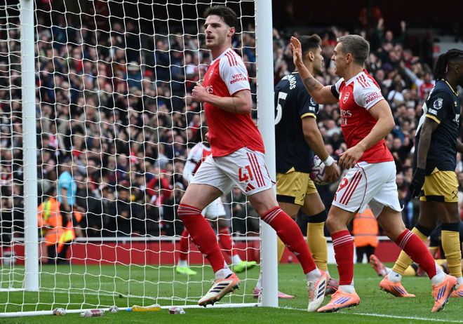第32分钟,萨卡右路一对一传中,阿森纳禁区围攻连续打门被挡;第38分钟,刚刚替换受伤厄德高上场的苏比门迪直传,埃反越位扫到门前被挡出,二点的赖斯大力抽射破门,1:0!考虑到西汉姆是自己的老东家,赖斯并没有选择庆祝。