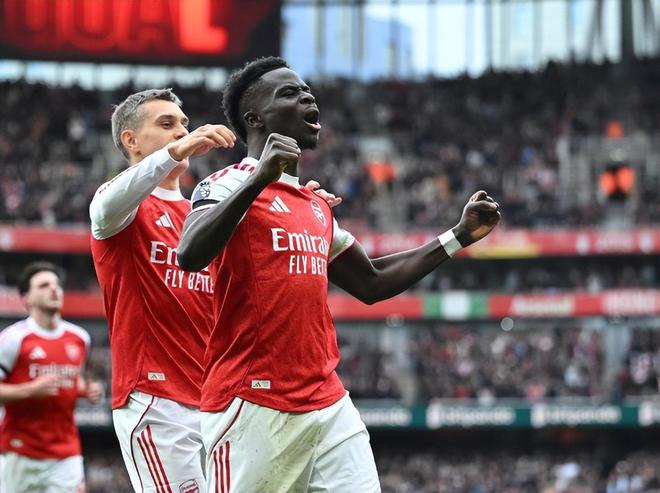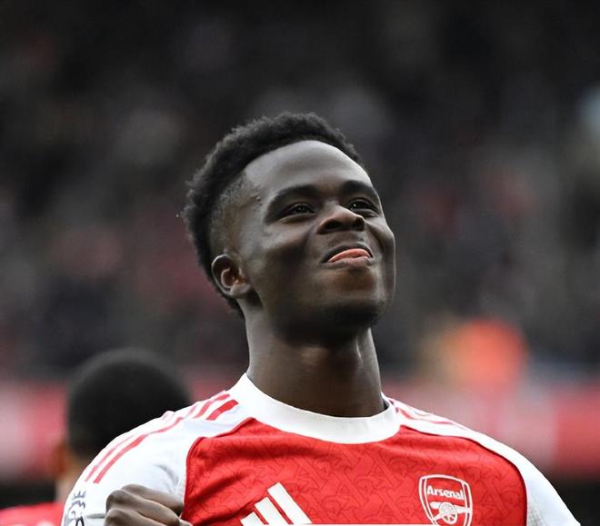 下半场换边再战第66分钟,苏比门迪长传,廷贝尔转身抹过防守接球进入禁区被迪乌夫直接拉倒在地,主裁判判罚点球;萨卡自己主罚命中,2:0!这是萨卡个人第200场英超,他也用一粒进球完成里程碑时刻;同时萨卡在英超已经贡献了55个进球和45次助攻,直接参与进球的数量正式达到了100个。