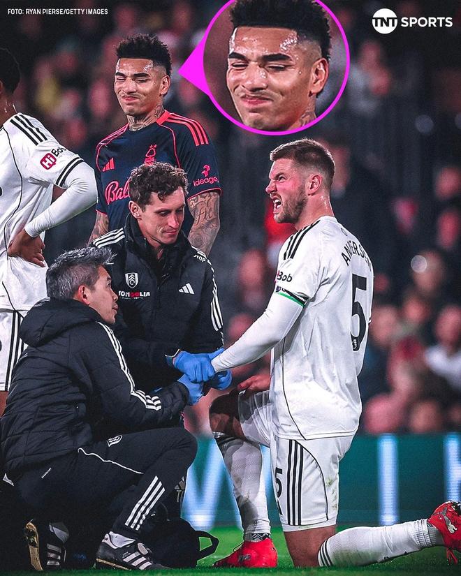 比赛暂停后,富勒姆队医冲入球场,而据现场转播视角发现,约西姆-安诺生的手指脱臼了,他的左手无名指与其他几根手指的方向不同,队医在现场为约西姆-安诺生复位,而他本人也不敢看。
