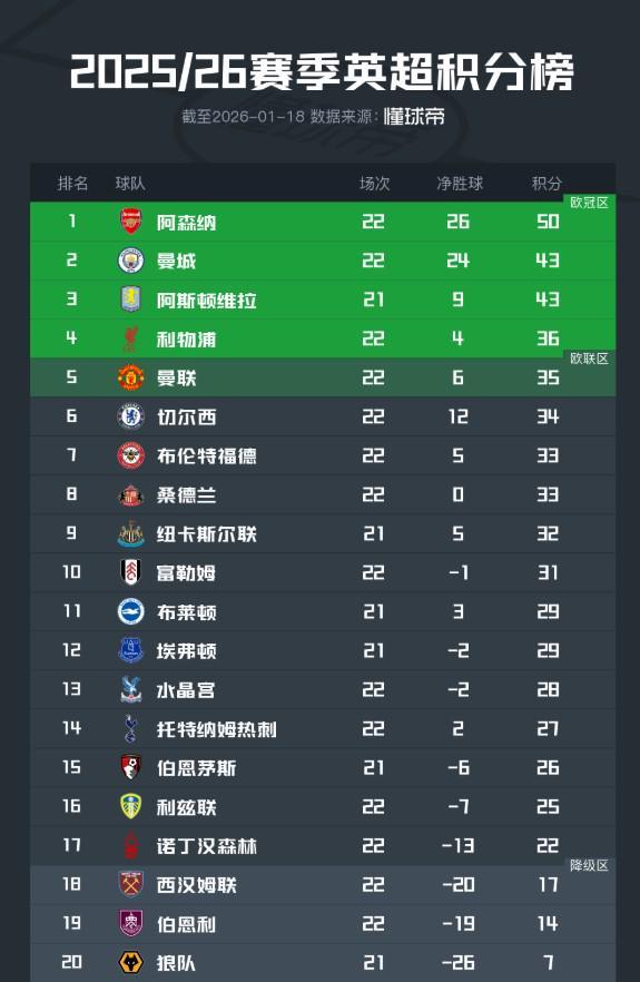 北京时间1月18日,2025/26赛季英超联赛结束了第22轮的大部分较量,积分榜的形势也产生了进一步的变化。