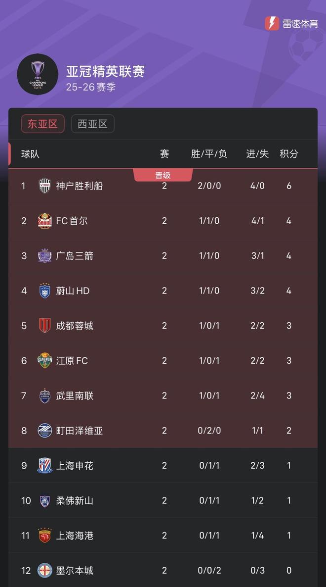 亚精英赛两轮过后,成都蓉城1胜1负积3分排名第5 ,上海海港1平1负积1分排名第11,上海申花同样1平1负积1分暂列第9。